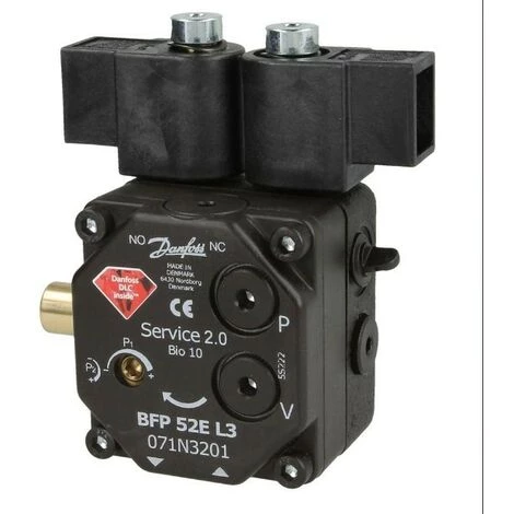 Danfoss Diamond BFP 52 L3 est une pompe de brûleur fioul compacte tournant à gauche avec deux niveaux de pression, un filtre et deux vannes de réglage de pression.